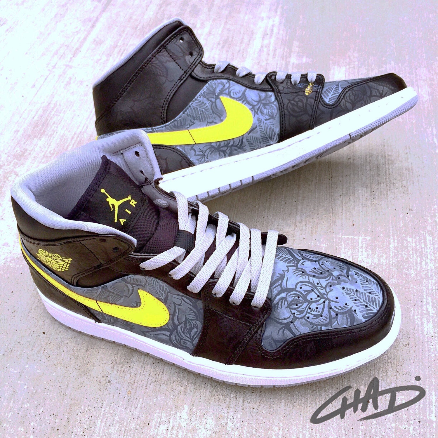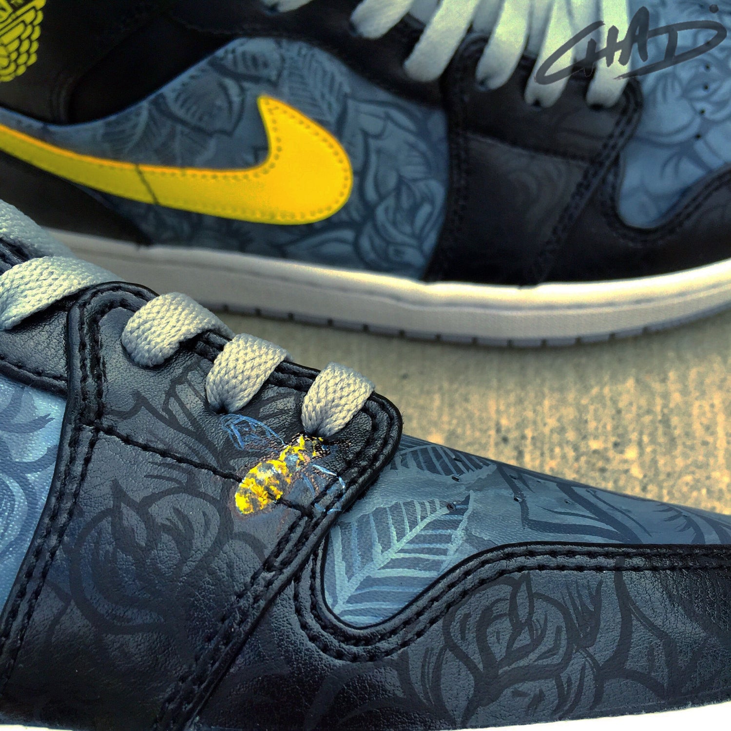 My Shadow Rose Jordan's...gloss black on matte black rose pattern creates a dramatic back drop with dark grey roses painted into the shadows of the shoe panels with bright yellow pops of color trim. A couple organically placed killa beez' and you have a winning combination.