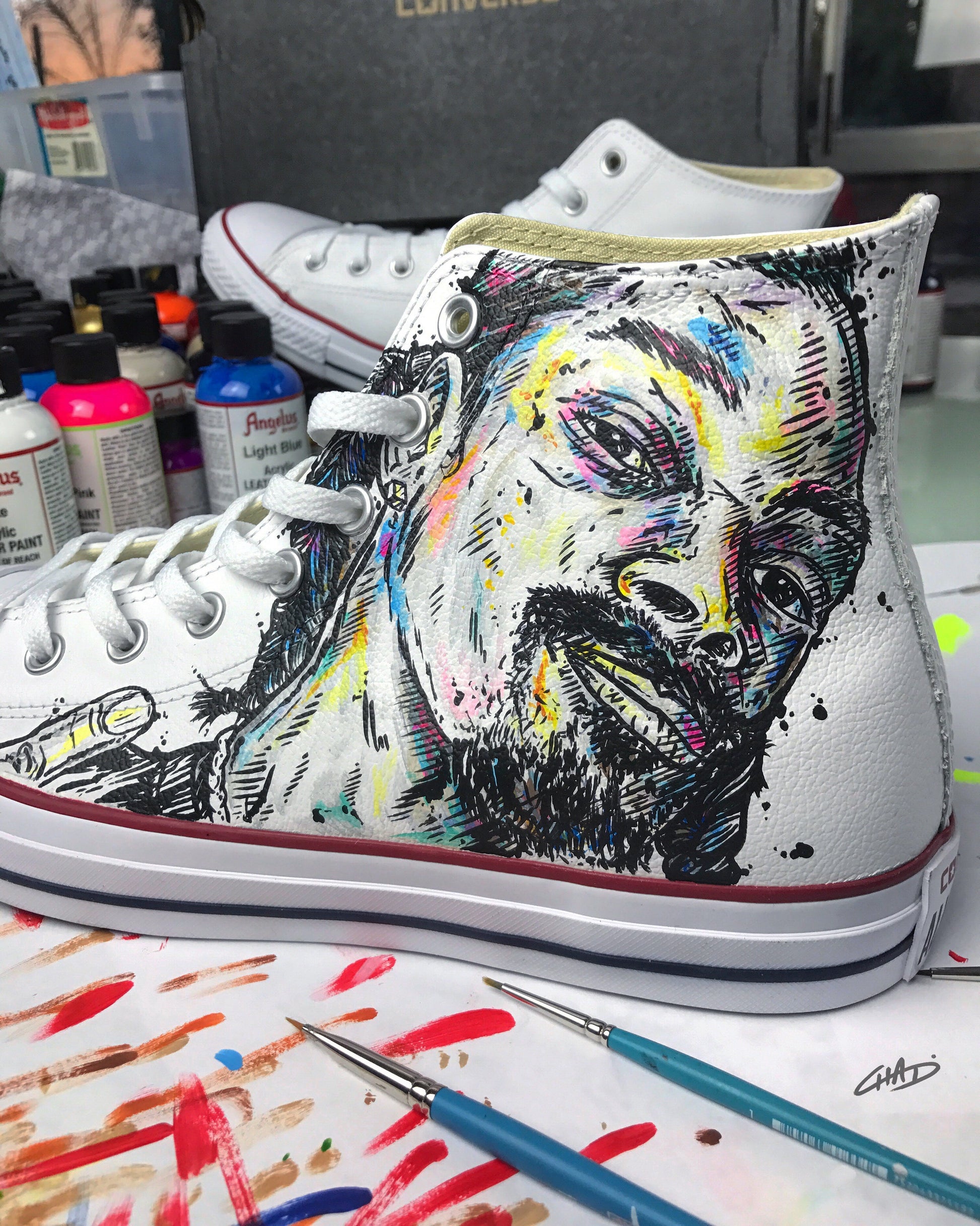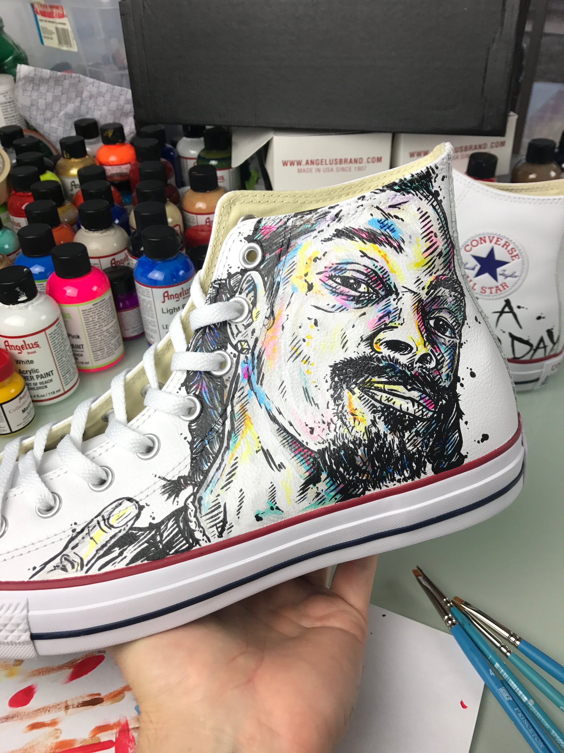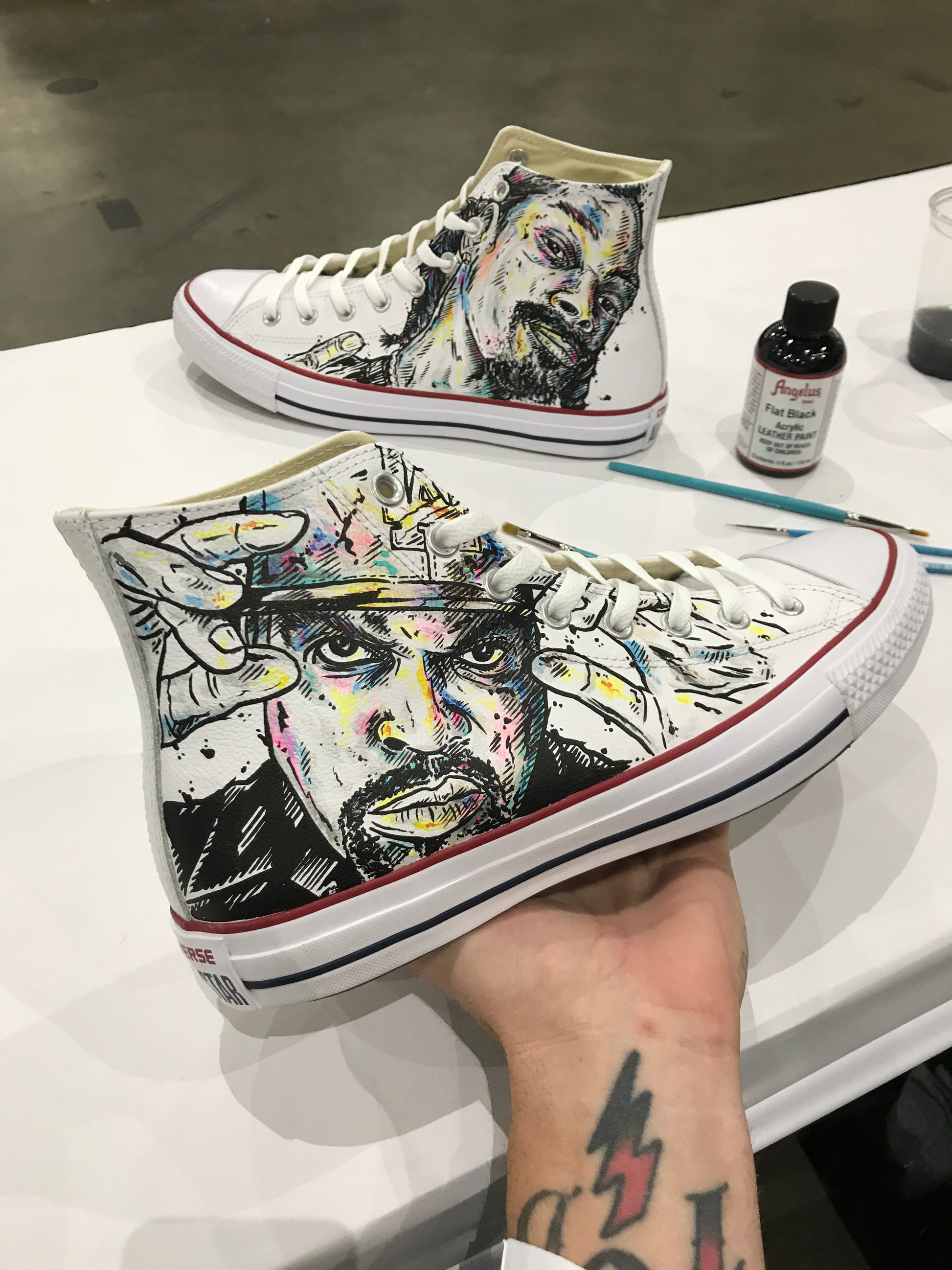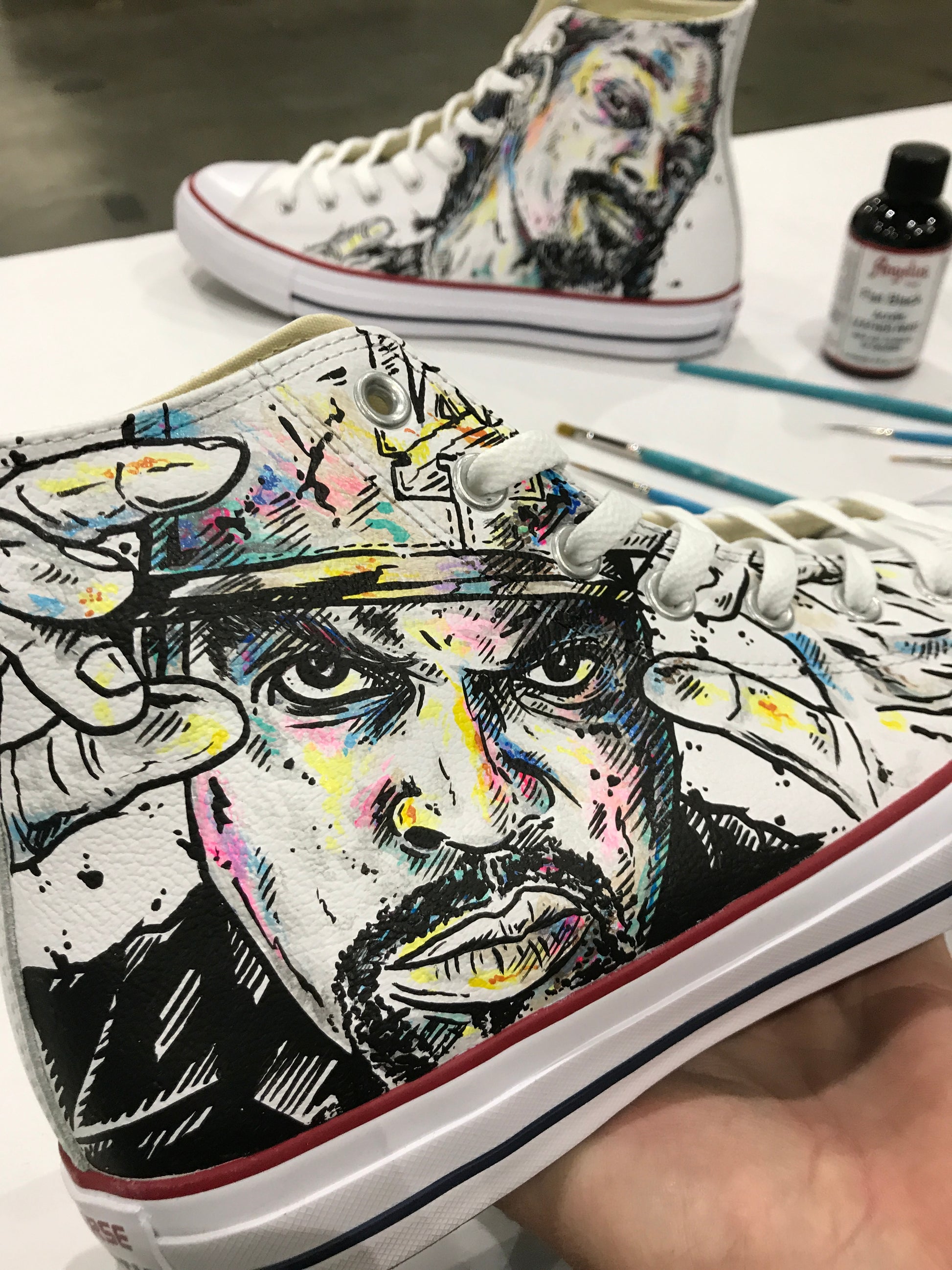 Snoop and Ice portraits freehand painted in my signature style on a pair of OG leather chucks. Created Live at the BET Experience in Los Angeles for feature display.