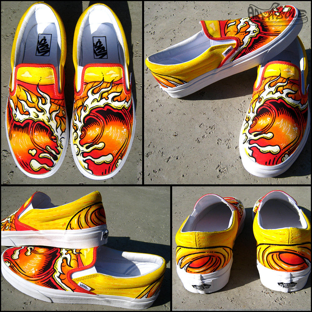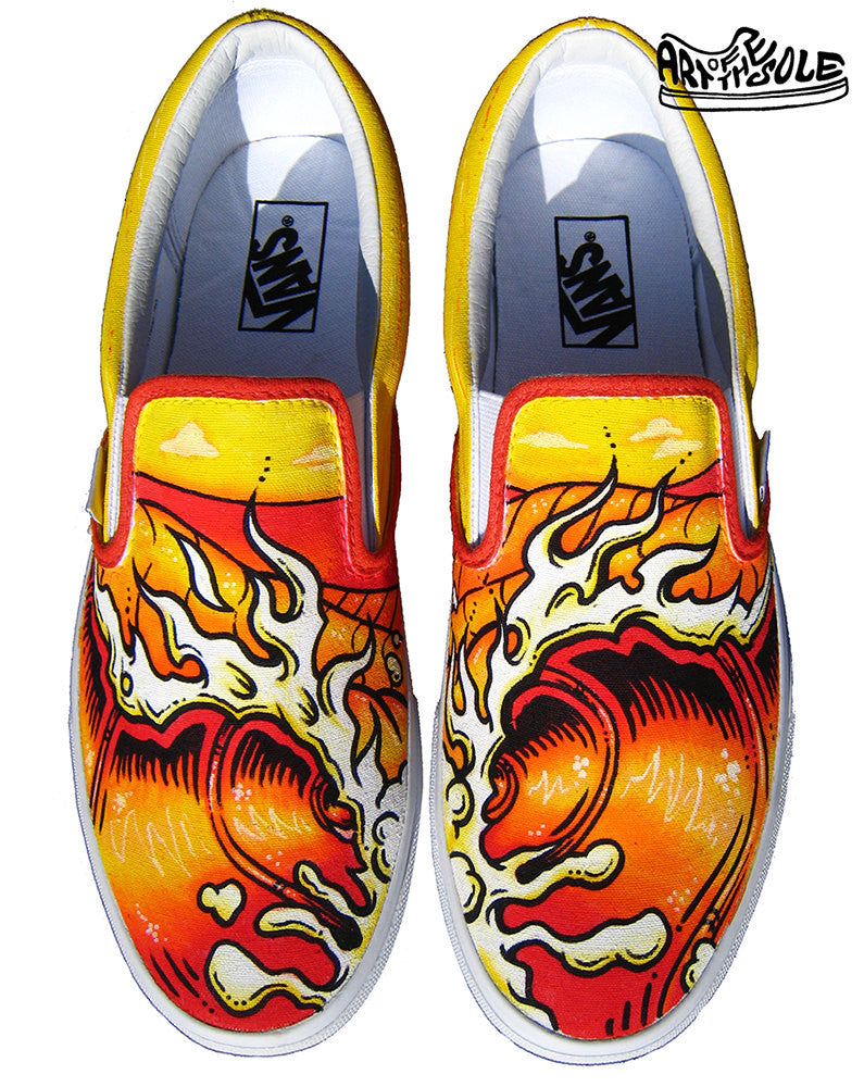 Custom hand painted Vans Classics Slip On shoes featuring "Endless Summer" colors and lava fire waves inspired artwork. These shoes are highly detailed with artwork spanning from one show to the other. The colors are bold and vibrant with contrasting splashes of white foam peeling off the wave. All sizes in stock of this series. Mens/Guys only Each pair of shoes comes with a certificate card signed and numbered by Chad, authenticating your shoes.