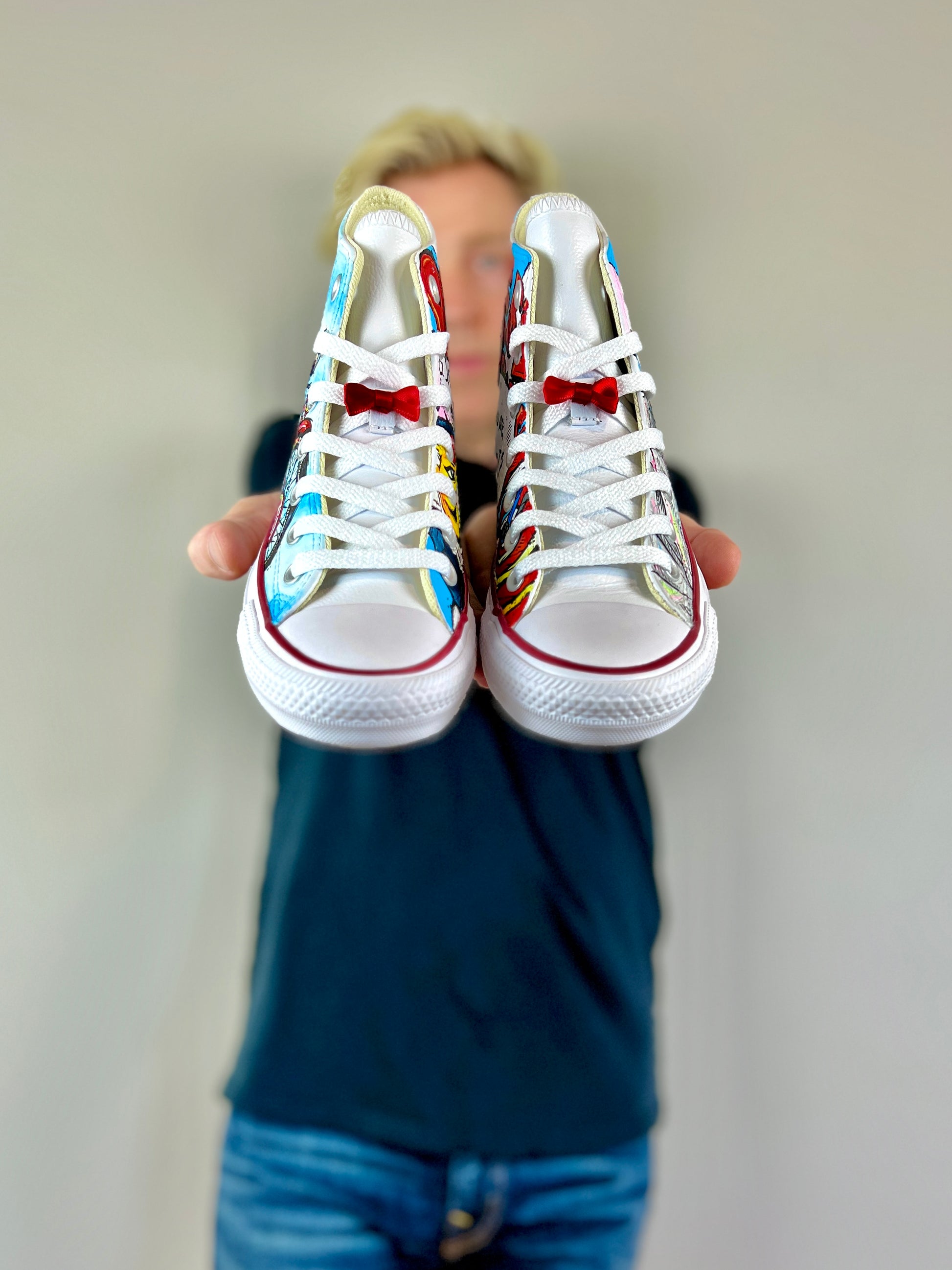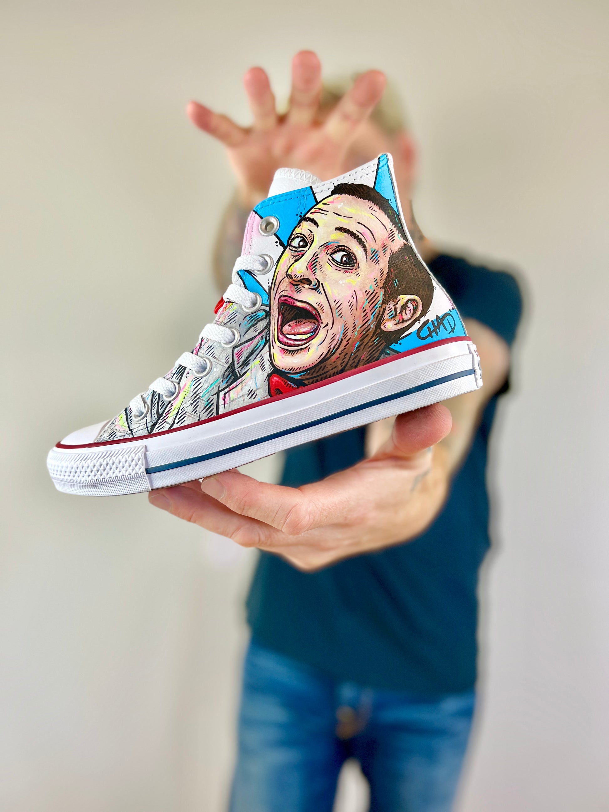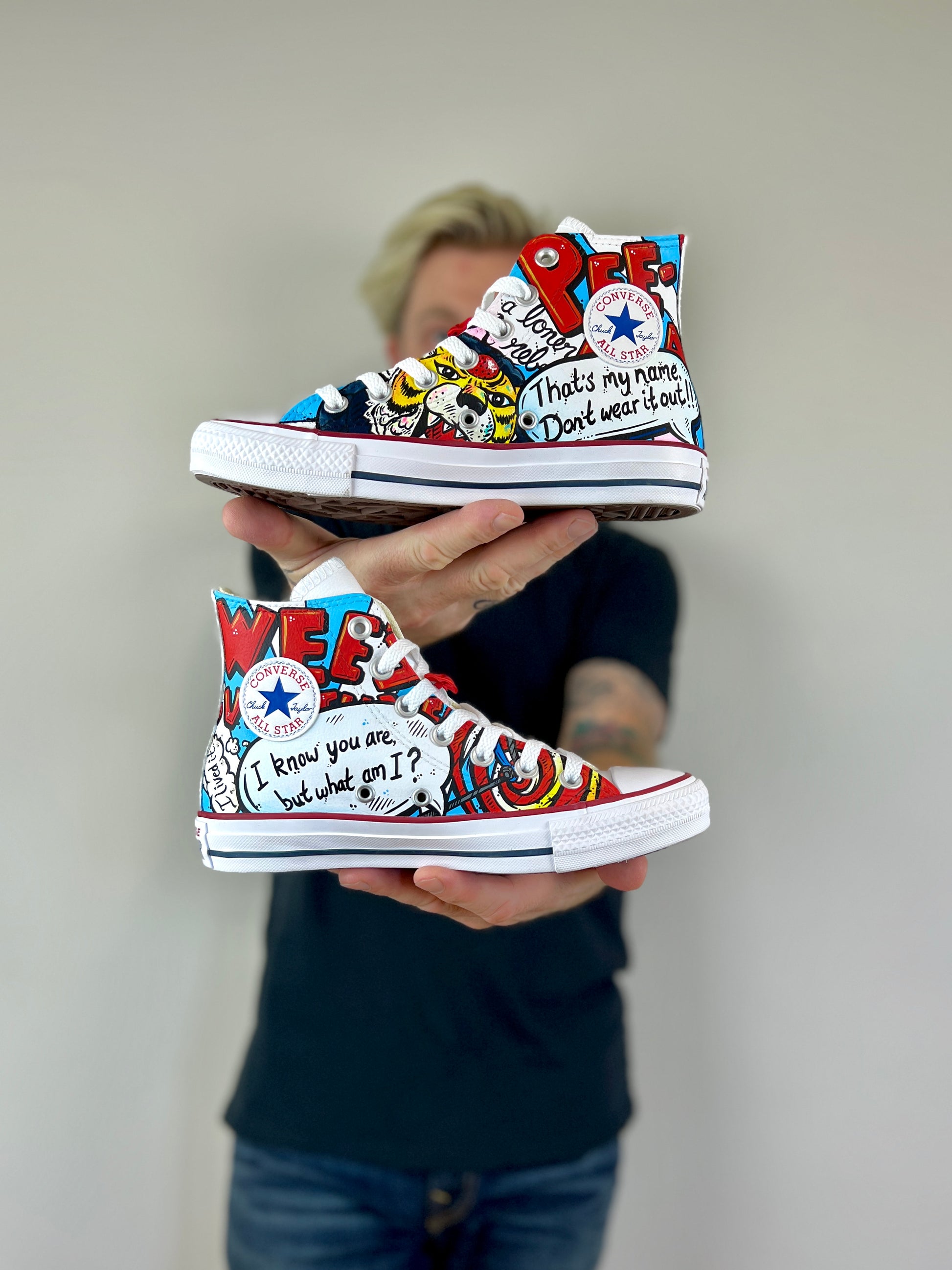 Pee Wee Herman. Iconic. The story of him and his bicycle told on a pair of Converse for radio host and personality Megan Holiday. These are 1 of 1 and will not be recreated as shown.